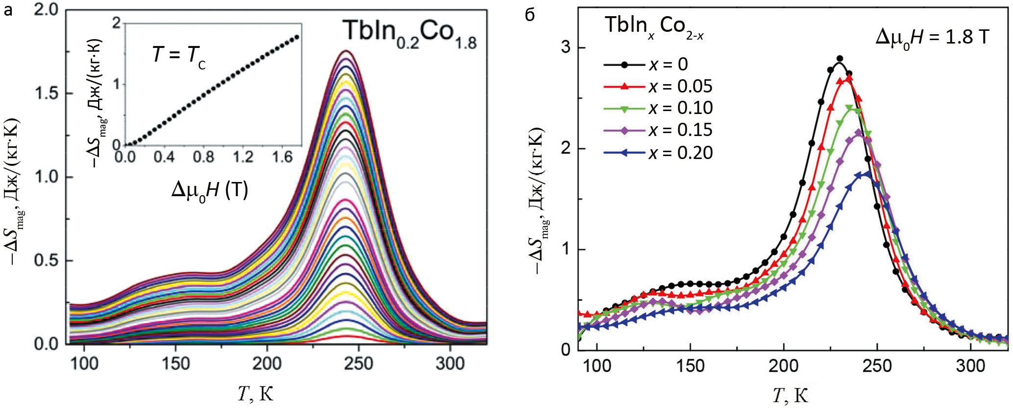 Как показано на рис. 4а, для состава TbIn0.2Co1.8 вблизи температуры упорядочения 245 К изменения магнитной части энтропии принимают максимальные значения и составляют |–ΔSmag| = 1.75 Дж/кг∙К. Размытый пик в области 160 К может быть вызван, по-видимому, наличием второй фазы. Гистерезис полевых зависимостей изменения магнитной части энтропии вблизи температуры Кюри отсутствует, ΔSmag увеличивается практически линейно (вставка на рис. 4а). Для остальных исследованных составов температурные и полевые зависимости ΔSmag имеют аналогичный вид.