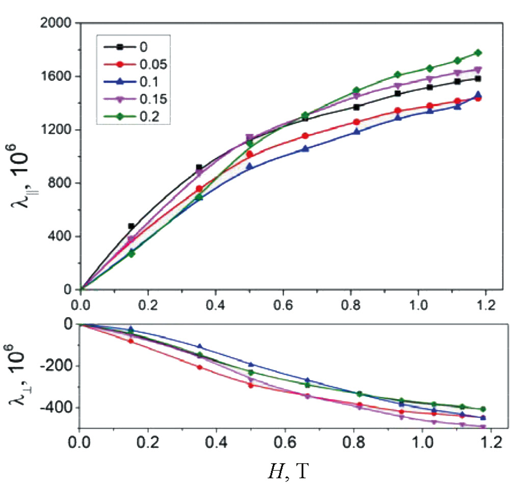 На рис. 6 показаны полевые зависимости продольной и поперечной магнитострикции составов TbInxCo2-x при 100 К. Видно, что как у исходного состава TbCo2, так и у всех замещенных, продольная магнитострикция при низких температурах положительна, а поперечная – отрицательна. В области низких температур частичное замещение кобальта индием незначительно влияет на магнитострикционные свойства, сохраняя их высокие значения. Однако заметим, что величины магнитного поля 1.2 Тл недостаточно для выхода кривых на насыщение.