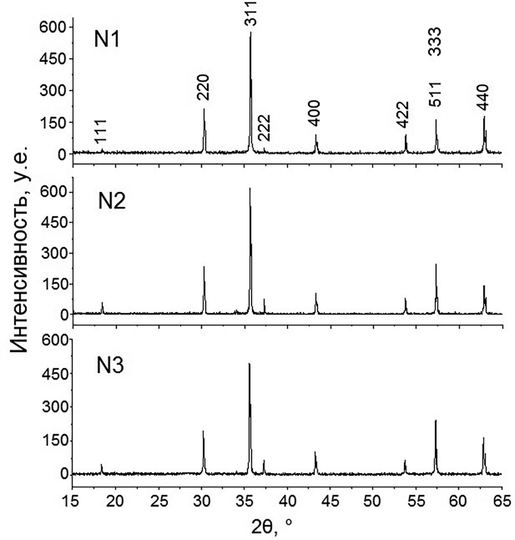 Рентгенограммы образцов спеченного феррита Li0.4Fe2.4Zn0.2O4 с разным содержанием Bi2O3 представлены на рис. 1. Структура шпинели является основной фазой для всех образцов независимо от концентрации добавки. У образца N3 в интервале 2θ=26°–28° можно увидеть едва различимое увеличение фона, связанное с наличием аморфной фазы. Согласно [23, 24], в этом диапазоне углов могут наблюдаться максимально интенсивные отражения от Bi2O3. Для всех исследуемых образцов были получены значения параметра решетки основной фазы (шпинели) и приведены в табл. 1.