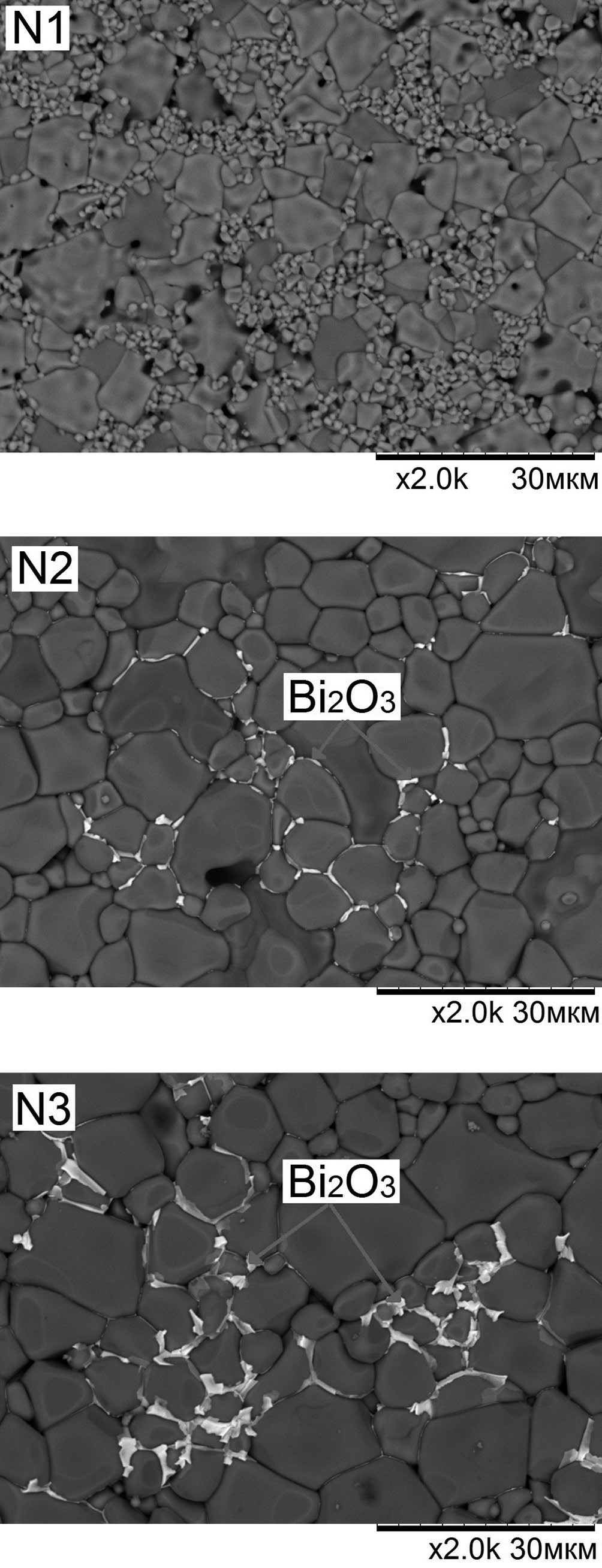 СЭМ-изображения поверхности LiZn-феррита, спеченного с разным содержанием Bi2O3, приведены на рис. 2. На снимках поверхности (N2 и N3) мы можем отчетливо видеть оксид висмута, который при спекании образует жидкую фазу и концентрируется на границах раздела зерен.