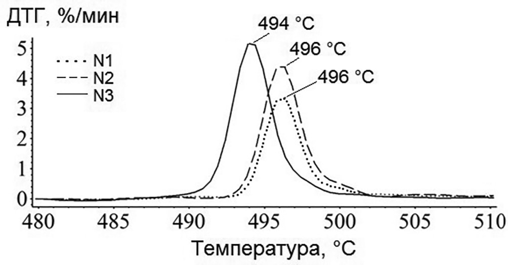 ДТГ-кривые образцов N1-N3 представлены на рис. 3. Данные были получены в процессе нагрева ферритов в магнитном поле. На ДТГ-кривой образца N1 наблюдается пик в области температуры ~496°С. Полученное значение близко к температуре Кюри для феррита данного состава [27, 28]. Как видно из рис. 3, введение 2 вес. % Bi2O3 приводит к снижению температуры Кюри лишь на 2°С, что свидетельствует о незначительном влиянии добавки на магнитный фазовый переход в LiZn феррите.