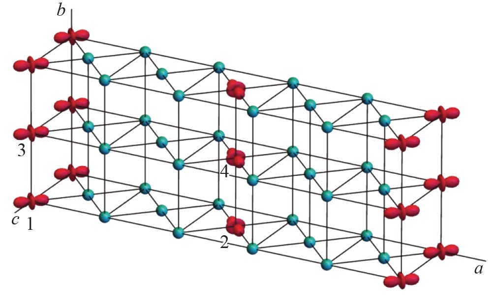 Рис. 1. Орбитально-зарядовая структура La1/4Ca3/4MnO3 [14]. Здесь и в последующих рисунках ионы Mn3+ изображены в виде распределения электронных плотностей, ионы Mn4+ обозначены сферами. Числа нумеруют подрешетки орбитальной структуры.