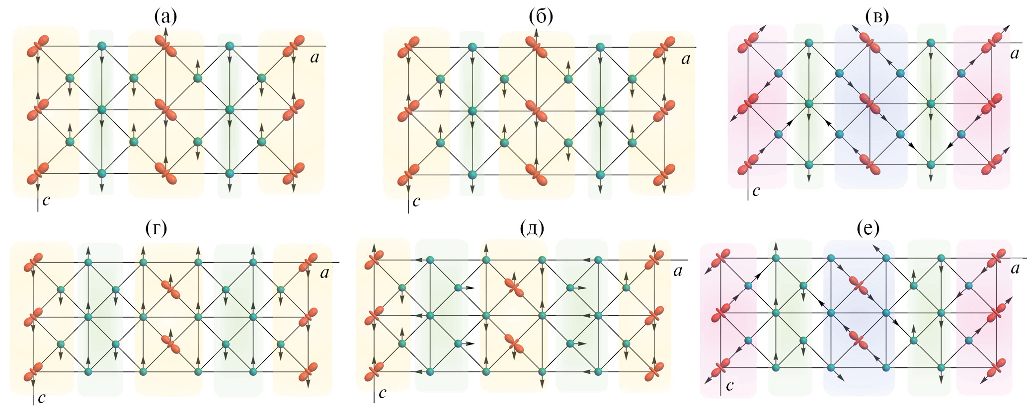 Рис. 4. Возможные равновесные магнитные структуры манганитов с орбитально-зарядовой структурой “вигнеровский кристалл”, x = 3/4, 4/5. В соседней плоскости ac направления магнитных моментов противоположны. (a–в) – магнитные структуры для La1/4Ca3/4MnO3; a – магнитная структура типа 1 без удвоения магнитной ячейки, б – магнитная структура типа 2 с упорядочением страйпов вдоль орторомбической оси (например, с), в – магнитная структура типа 2 со взаимно перпендикулярным упорядочением страйпов Mn4+– Mn3+– Mn4+ и одним из возможных упорядочений промежуточного страйпа; (г–е) – магнитные структуры для Bi1/5Ca4/5MnO3; г – магнитная структура типа 1 без удвоения магнитной ячейки, д – магнитная структура типа 2 с упорядочением страйпов Mn4+– Mn3+– Mn4+ вдоль орторомбической оси (например, с) и одним из возможных упорядочений промежуточного страйпа, е – магнитная структура типа 2 со взаимно перпендикулярным упорядочением страйпов Mn4+– Mn3+– Mn4+ и одним из возможных упорядочений промежуточного страйпа.