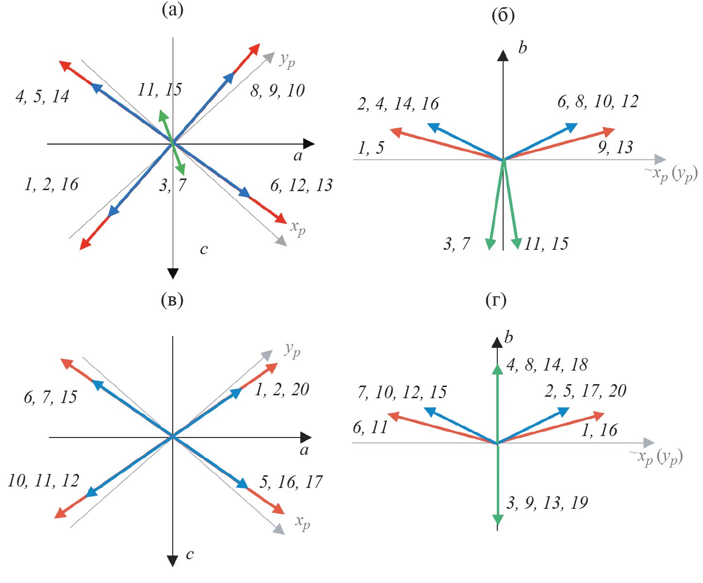 В результате поиска минимума магнитной энергии, соответствующей гамильтониану (7), смоделирована магнитная структура обоих соединений, аналогичная La1/3Ca2/3MnO3 [22] и состоящая из трех типов страйпов, расположенных в плоскости bc. Два страйпа Mn4+–Mn3+–Mn4+ имеют основное направление спинов примерно вдоль псевдоперовскитных осей xp, yp. Третий – промежуточный – страйп состоит из ионов Mn4+ и обладает направлением спинов примерно вдоль оси b, совпадающей с псевдоперовскитной осью zp. Направления с номерами подрешеток, соответствующих рис. 5, приведены на рис. 6a.