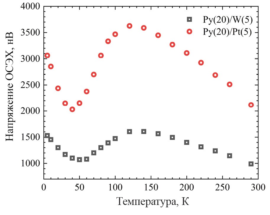 В нашем случае в диапазоне температур от 295 до 100 К параметр Гильберта равен 0.01 для образца Py/W и 0.013 для структуры Py/Pt. Далее с уменьшением температуры для обоих образцов наблюдается характерное увеличение α до значений 0.014 (Py/W) и 0.019 (Py/Pt) при 50 К, затем наблюдается спад параметра вплоть до значений 0.011 (Py/W) и 0.015 (Py/Pt). Ранее на подобных структурах наблюдали схожее поведение температурных зависимостей, которое связывают с дополнительным слагаемым в суммарном затухании системы, которое возникает из влияния шероховатости поверхности образца и интерфейса тяжелый металл/ферромагнетик [29, 30, 31]. В случае с тонкими пленками пермаллоя также наблюдали максимум на температуре 50 К, но на образцах с меньшей толщиной пермаллоя (3 и 5 нм). В этом случае такое поведение системы объясняли тем, что имеет место спиновый переориентационный переход на поверхности пленки при низкой температуре [29]. В случае наших структур, где есть слой с материалом с большим спин-орбитальным взаимодействием (Pt, W), вышеупомянутый пик имеет большую амплитуду. Этот факт позволяет сделать вывод о том, что увеличение параметра затухания Гильберта в указанном температурном диапазоне имеет спин-орбитальный характер. Для подтверждения этой гипотезы нами был проведен эксперимент по измерению напряжения ОСЭХ.