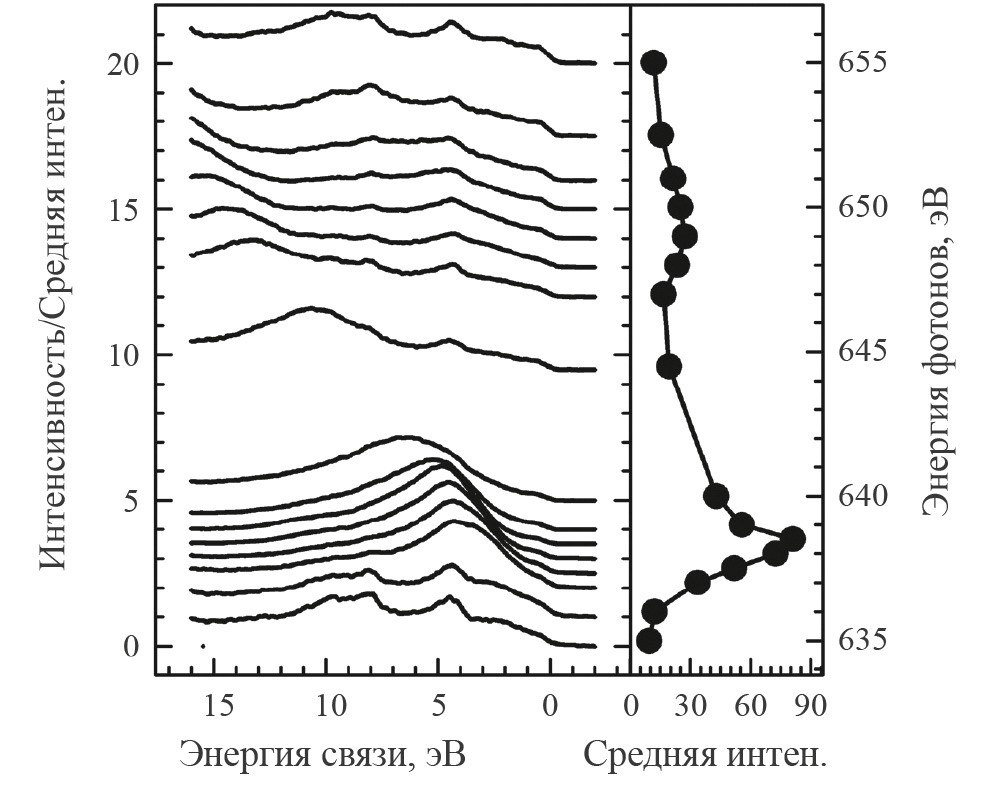 Фотоэмиссионные спектры при прохождении порога возбуждения вблизи Mn L2,3-края (возбуждение 2p3/2, p1/2→3d) показаны на рис. 4. При резонансе общий выход фотоэлектронов увеличивается в 8.5 раз. Сильно изменяется форма спектра, возникает мощный максимум в области 5 эВ, переходящий в оже-линию при энергии возбуждения 640 эВ и выше. При прохождении по энергии возбуждения L2-края марганца также наблюдается увеличение фотоэмиссии из валентной полосы, но оно существенно меньше, чем на L3-крае, в основном, из-за более короткого времени жизни дырки на 2р1/2- уровне вследствие заполнения ее электроном из вышележащих 2р3/2-состояний (переход Костера–Кронига).