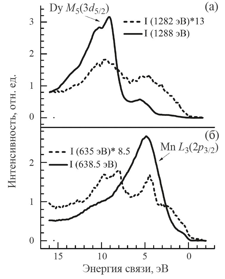Для более детального анализа изменений формы валентной полосы на рис. 6 попарно приведены фотоэмиссионные спектры – до резонанса и при резонансном возбуждении соответствующих уровней. Интенсивность резонансного спектра при возбуждении Dy 3d5/2-уровня в 13 раз больше (рис. 6a). Энергия связи атома Dy равна 1292.6 эВ. Энергия промежуточного состояния на 4.6 эВ ниже разности одноэлектронных энергий за счет притяжения электрона и дырки. Хорошо видно, что f-электроны диспрозия дают основной вклад в валентную полосу в окрестности 10 эВ. Интенсивность резонансного спектра при резонансном возбуждении Mn 2p3/2-уровня в 8.5 раз больше нерезонансного (рис. 6б). Энергия связи Mn 2p3/2-уровня равна 638.7 эВ. Поле Mn 2р дырки хорошо экранировано, нет сдвига энергии в промежуточном состоянии, d-состояния марганца локализованы в окрестности 5 эВ.