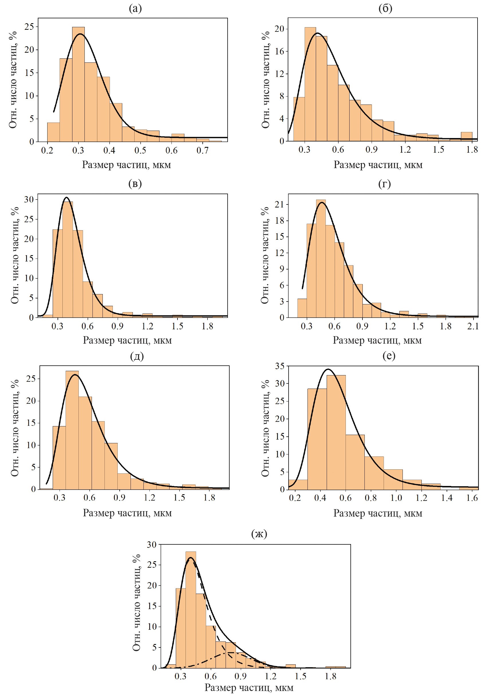 Рис. 2. Распределение частиц по размерам в порошках ZnO–ZnS, синтезированных без примеси (а) и с оксидами V2O5 (б), MnO (в), Fe2O3(г), CoO (д), NiO (е) и CuO (ж). Столбчатые диаграммы – экспериментальные гистограммы, сплошная линия – аппроксимирующая кривая в виде логнормального распределения. Для CuO (ж) штриховая линия – логнормальная зависимость; штрихпунктирная – гауссово распределение; сплошная линия – суммарная кривая.