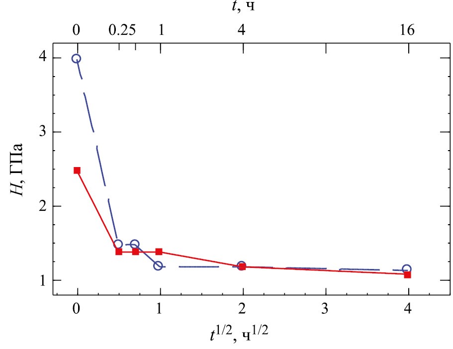 Рис. 2. Изменение твердости (Н) в результате отжига при 450°С железа, деформированного при 20 (○) и 250°С (■).