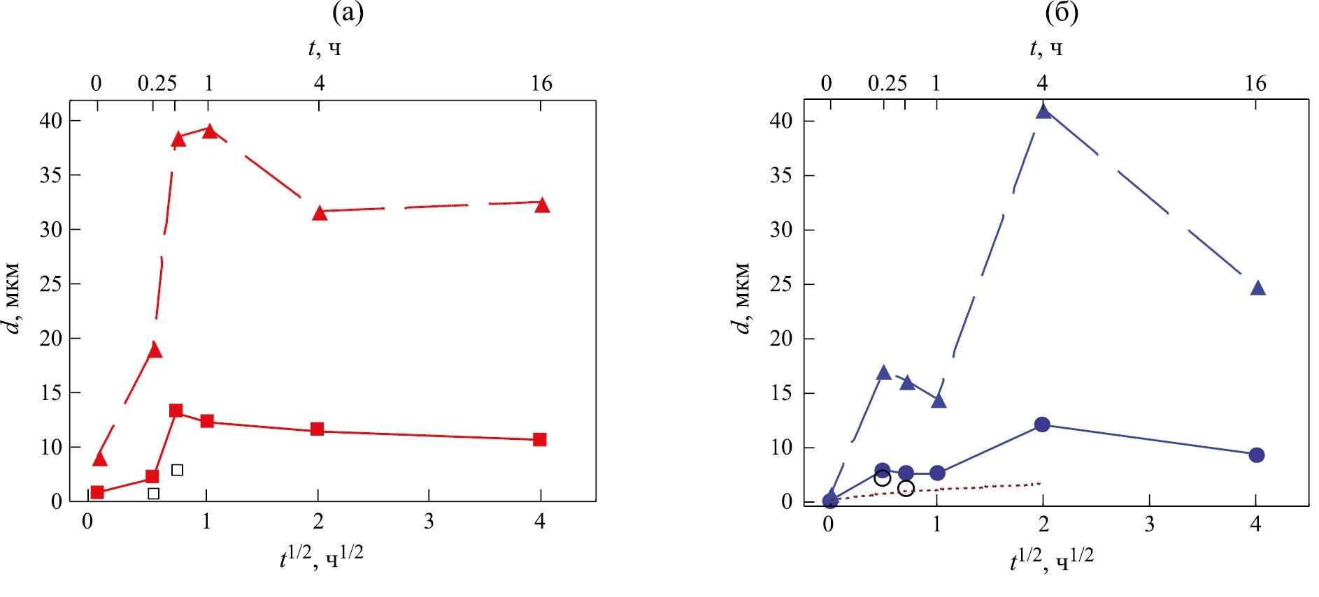 Рис. 6. Зависимости среднего (■, ●) и максимального размера зерна (▲, ▲) от длительности отжига железа, деформированного при 250 (а) и 20°С (б). Залитые значки – РЭМ, прозрачные значки (□, ○) – размер элементов структуры, усредненный по данным ПЭМ. На рис. 6б пунктирной линией для сравнения приведена зависимость для железа, деформированного при 20°С и отожженного при 300°С [7].