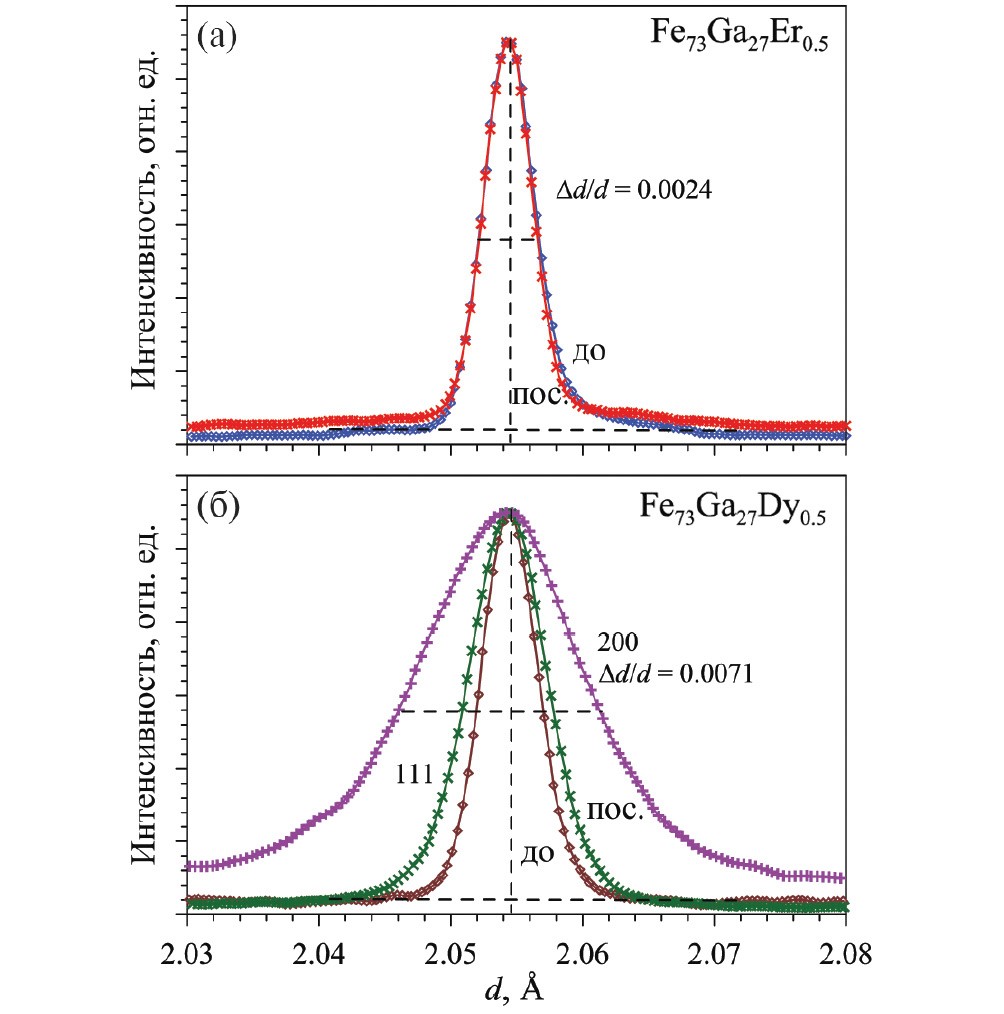 Рис. 2. Профили дифракционных пиков сплавов Fe73Ga27Er0.5 (a) и Fe73Ga27Dy0.5 (б), измеренные на HRFD (высокое разрешение) до (до, ромбы) и после (пос., кресты) медленного нагрева–охлаждения. Для фазы D03 (сплав с Er до нагрева и после охлаждения, и с Dy до нагрева) показаны профили пика 220. Для фазы L12 (сплав с Dy после охлаждения) показаны профили пиков 111 и 200. Пики нормированы по амплитуде и совмещены по межплоскостному расстоянию.