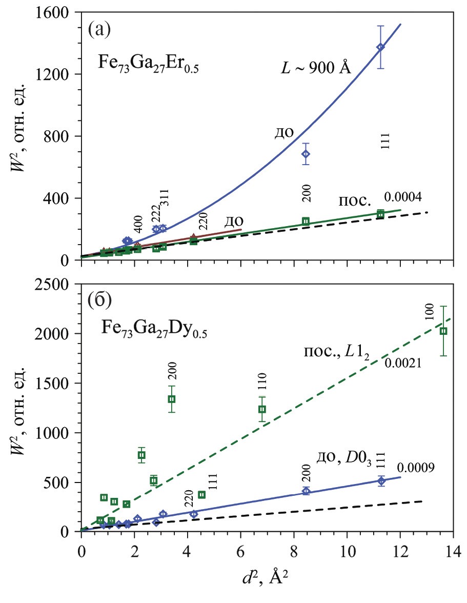 Для выявления причин уширения дифракционных пиков был проведен анализ с использованием метода Вильямсона–Холла. Он показал (рис. 3а), что экспериментальные зависимости величин W2 от d2, где W – ширины пиков, d – межплоскостное расстояние, являются линейными для основных и параболическими для сверхструктурных пиков в сплавах с Er, Tb и Yb, находящихся в исходном состоянии. После нагрева–охлаждения этих сплавов указанная зависимость становится линейной для всех дифракционных пиков в спектре. Это означает (подробная интерпретация эффекта дана в [18]), что микроструктура сплавов с Er, Tb и Yb в исходном состоянии представляет собой структурно неупорядоченную матрицу фазы A2 с дисперсно встроенными в нее кластерами упорядоченной фазы D03, характерные размеры которых составляют ~900 Å. В результате медленных нагрева и охлаждения атомная структура всего объема сплавов упорядочилась, превратившись в фазу D03. Некоторое превышение ширин основных дифракционных пиков над вкладом функции разрешения HRFD связано исключительно с наличием статических флуктуаций параметра элементарной ячейки (микродеформациями), ε = Δa/a ≈ 0.0004. Следует отметить, что параметры элементарных ячеек, определенные по основным и по сверхструктурным дифракционным пикам, практически идентичны, что означает высокую степень когерентности элементарных ячеек матрицы и кластеров (подробнее см. [14]). Совершенно другая ситуация реализуется для сплава с Dy (рис. 3б). А именно, исходное состояние – однородное (фаза D03), состояние после нагрева–охлаждения (фаза L12) – сильно и анизотропно напряженное. Похожая морфология микроструктуры была определена для литого сплава Fe73Ga27 [18], и показано, что построение Вильямсона–Холла может быть линеаризовано при учете дислокационного фактора контраста.