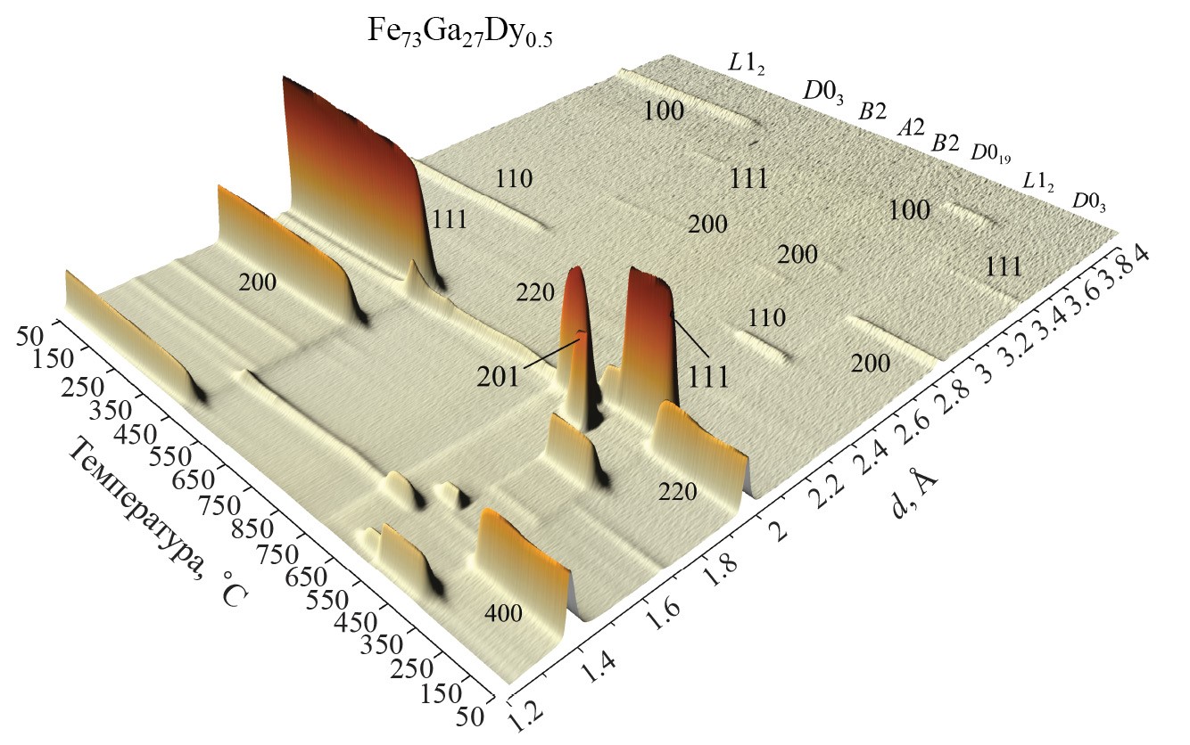 В Fe–Ga-сплавах с ~27 ат.% Ga возможно образование пяти типов структур [18], три из них основаны на ОЦК-ячейке: неупорядоченная А2 (кубическая, , a ≈ 2.91 Å, N = 2), частично или полностью упорядоченные D03 (кубическая, , a ≈ 2aА2 ≈ 5.82 Å, N = 16) и B2 (кубическая, , a ≈ 2.92 Å, N = 2), а также L12 (кубическая структура ГЦК-типа, , a ≈ 3.72 Å, N = 4) и D019 (гексагональная структура ГПУ-типа, P63/mmc, a ≈ 5.22 Å, c ≈ 4.23 Å, N = 8). Разупорядочение структуры L12 переводит ее в А1 (ГЦК-ячейка, , a ≈ 3.72 Å), а структуры D019 – в А3 с уменьшенным в 2 раза параметром а (a ≈ 2.64 Å). Далее для единообразия индексации дифракционных пиков структур А2, B2 и D03 будет использоваться элементарная ячейка фазы D03, в которой основные пики определяются условием h + k + l = 4n (напр., 220, 400 и т.д.). Сверхструктурные пики в этой фазе разрешены, если все индексы Миллера нечетные (напр., 111, 311 и т.д.) или если h + k + l = 2n (напр., 200, 222 и т.д.). В фазе А2 сверхструктурные пики запрещены, а в B2 разрешены основные пики, если h + k + l = 4n и сверхструктурные, если h + k + l = 2n.