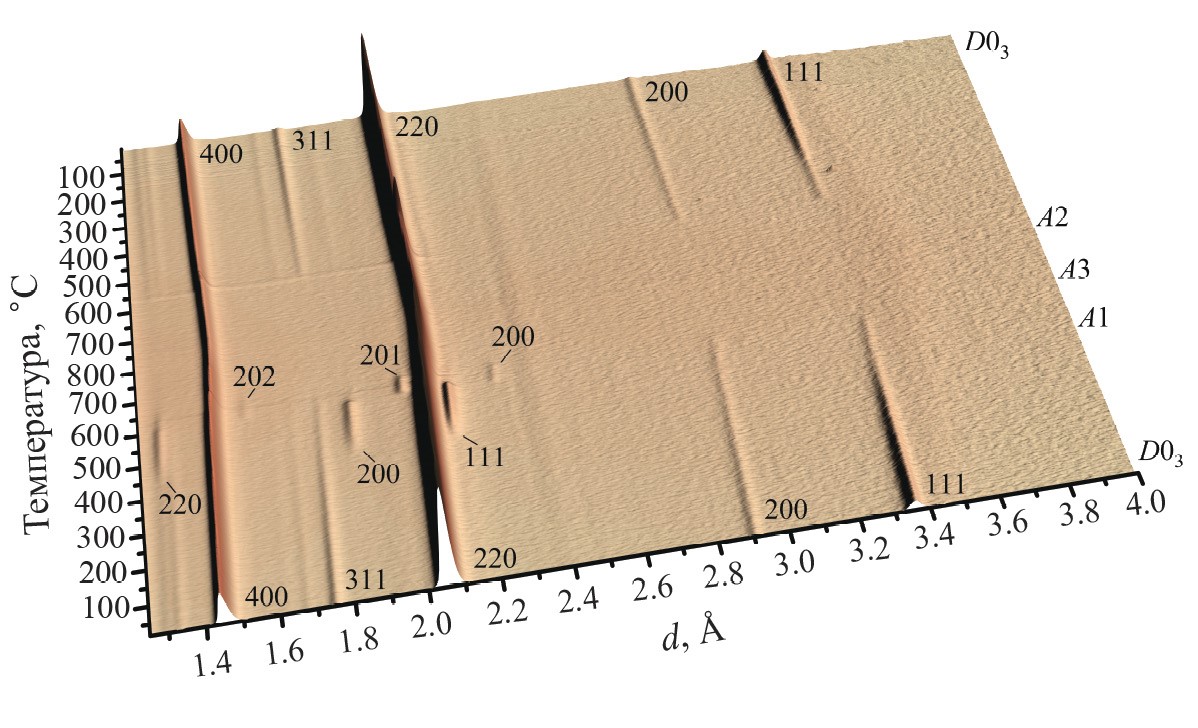 Рис. 5. Дифракционные спектры сплава Fe73Gа27Dy0.5, измеренные в ходе нагрева и последующего охлаждения со скоростью ±2°С/мин. Ось температуры (и времени) направлена снизу вверх, ось межплоскостных расстояний – слева направо. Исходное состояние образца – фаза D03, при нагреве происходят переходы D03 → L12 → D019 → B2 → A2, при охлаждении происходят переходы A2 → B2 → D03 → L12. Индексы Миллера пиков, принадлежащих фазам А2, B2 и D03, приведены для ячейки D03. Время измерения одного спектра – 1 минута, всего 3D-карта содержит около 900 спектров.