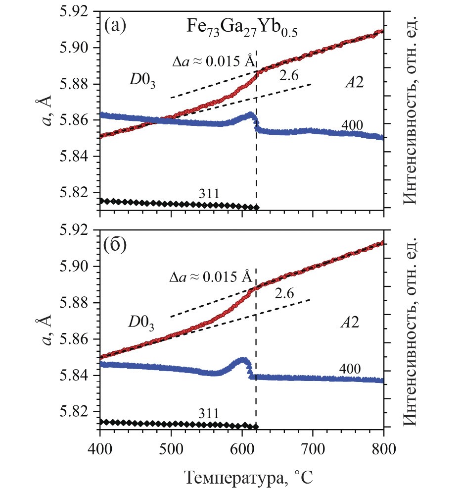 В бинарных сплавах, помимо поведения интенсивностей сверхструктурных пиков, о переходах порядок-беспорядок можно судить по зависимости параметров элементарной ячейки (атомного объема) от температуры [14]. Примеры характерного S-образного изменения параметра ячейки сплава Fe73Gа27Yb0.5 при появлении или исчезновении упорядоченных кластеров приведены на рис. 9. Вне области этих переходов наблюдается линейное изменение параметра с практически одинаковыми коэффициентами теплового расширения (сжатия) β = (Δa/a)/ΔT ≈ ≈ ±2.6·10-5 K-1, что заметно больше (на ~57%), чем у литого железа. Условный “скачок” параметра при этом составляет Δa/a ≈ 2.6·10-3. Поскольку параметр ячейки определяется из положений основных пиков, имеющих большую интенсивность, он может быть измерен с большой точностью и, соответственно, является более чувствительным индикатором перехода, чем поведение интенсивностей слабых сверхструктурных пиков.