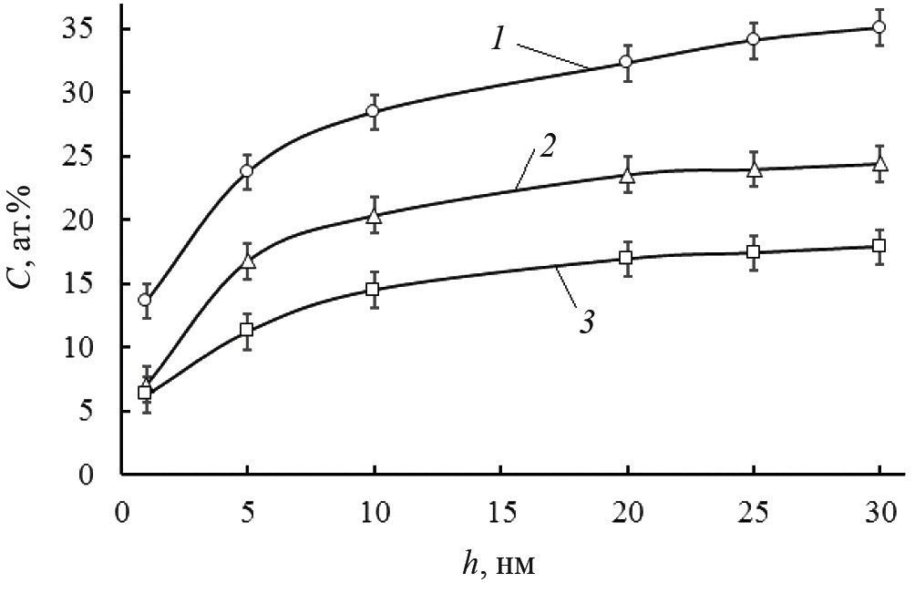 Из представленных данных следует, что исходная поверхность характеризуется достаточно глубоким до ~20 нм адсорбированным слоем, состоящим, в основном, из атомов титана и кислорода. По всей видимости, такую глубину имеет естественная пленка из оксидов титана на поверхности сплава, что является следствием высокой химической активности ее компонентов между собой. Облучение ионами N+ приводит к накоплению азота в приповерхностных слоях образцов (рис. 1б). Накопление азота осуществляется до концентраций более 30 ат. %. При этом характер изменений в профилях распределений атомов азота и титана совпадают. Это свидетельствует о влиянии атомов титана на накопление азота. Следует отметить, что ни при каких параметрах облучения ионами N+ образцов нержавеющей стали [21], образцов углеродистой стали марки Ст3 [22] и образцов армко-железа [23] не удается накопить азот до столь высоких концентраций. Это может косвенно свидетельствовать о существенной роли химической активности атомов титана и азота в формировании поверхностного слоя.