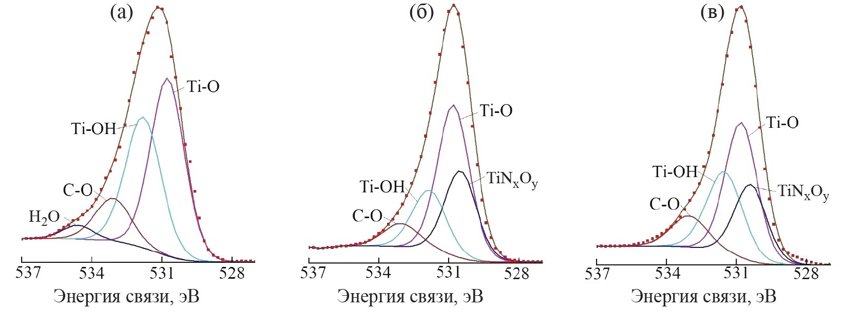 Анализ спектров О 1s с использованием методики разложения спектров позволяет выявить, что причиной такого сдвига является появление в спектре составляющей, соответствующей оксинитриду титана TiNxOy. Кроме этого, наряду с оксинитридом титана в спектре О 1s имеются составляющие от оксидов титана Ti–O, гидрооксидов титана Ti–OH и незначительной доли компоненты с C–O-связями. Компонента от Ti–O-связей во всех спектрах является преобладающей. Отличительной особенностью в спектре O 1s образца, облученного ионами N+ без предобработки, является отсутствие в спектре компоненты от оксинитрида титана TiNxOy. Полученные результаты свидетельствуют об интенсивном окислении атомов титана в условиях облучения ионами О+, что, очевидно, обусловлено высокой химической активностью атомов титана и кислорода [19, 20].