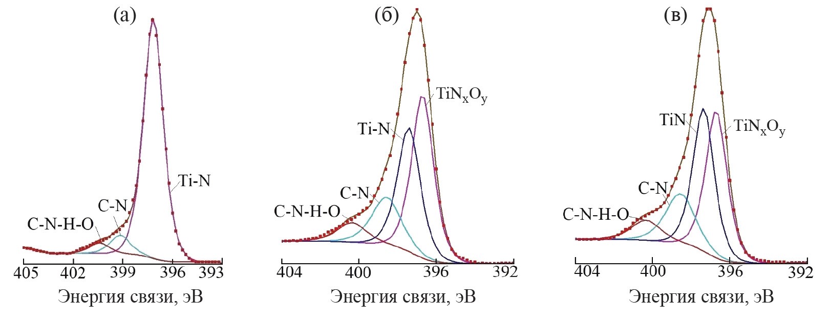 Рис. 5. РФЭ-спектр N 1s, полученный с глубины ~20 нм, в образце BT6 после имплантации N+ (a), после поочередного облучения ионами O+ и N+ с дозой ионов N+ 1018 ион/см2 (б), после поочередного облучения ионами O+ и N+ с дозой ионов N+ 3·1018 ион/см2 (в).