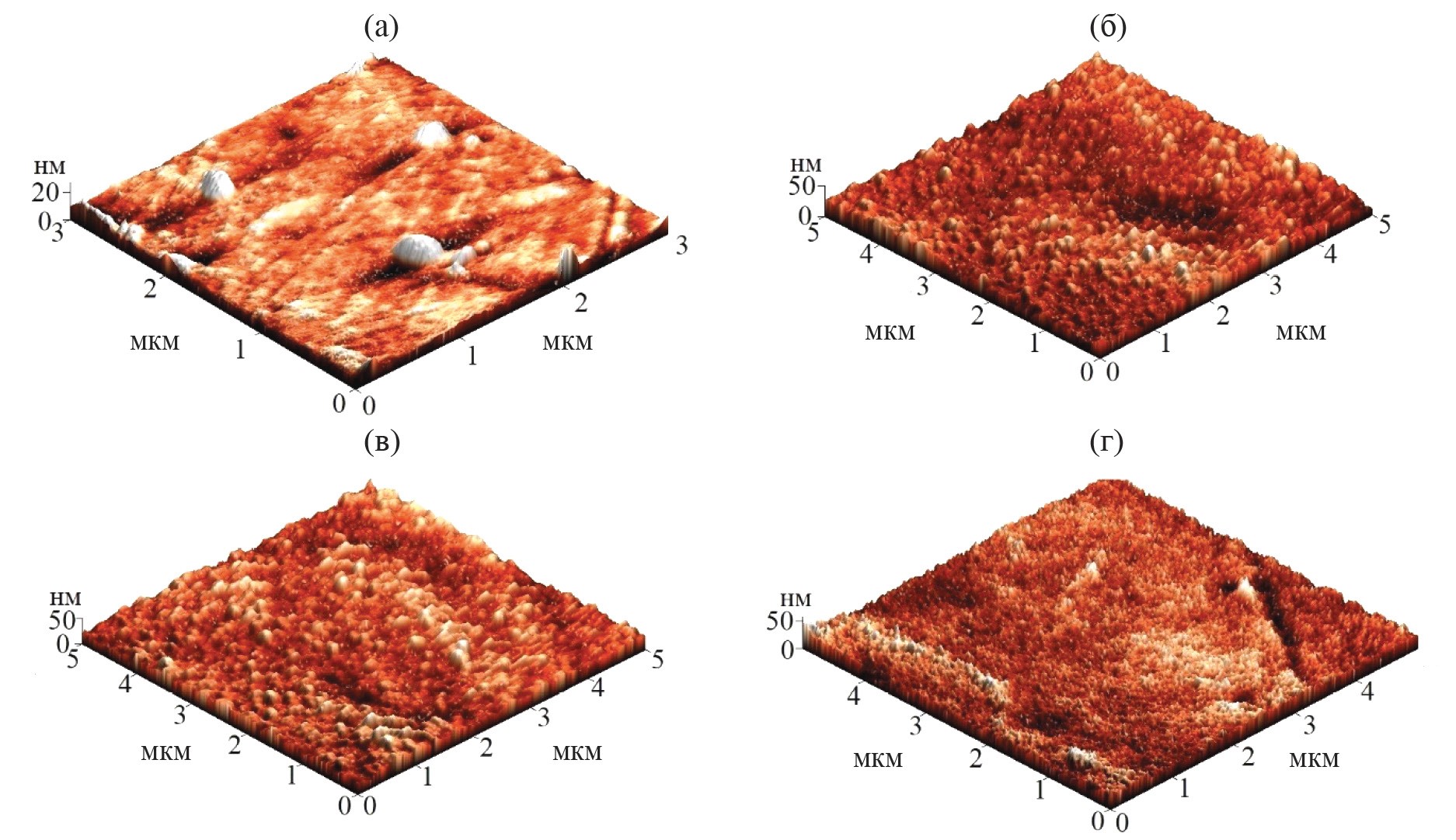 Рис. 7. АСМ-изображения поверхности образца титанового сплава ВТ6 до имплантации (а), после имплантации ионов O+ (б), после поочередного облучения с дозой ионов N+ 1018 ион/см2 (в) и после поочередного облучения с дозой ионов N+ 3·1018 ион/см2 (г).