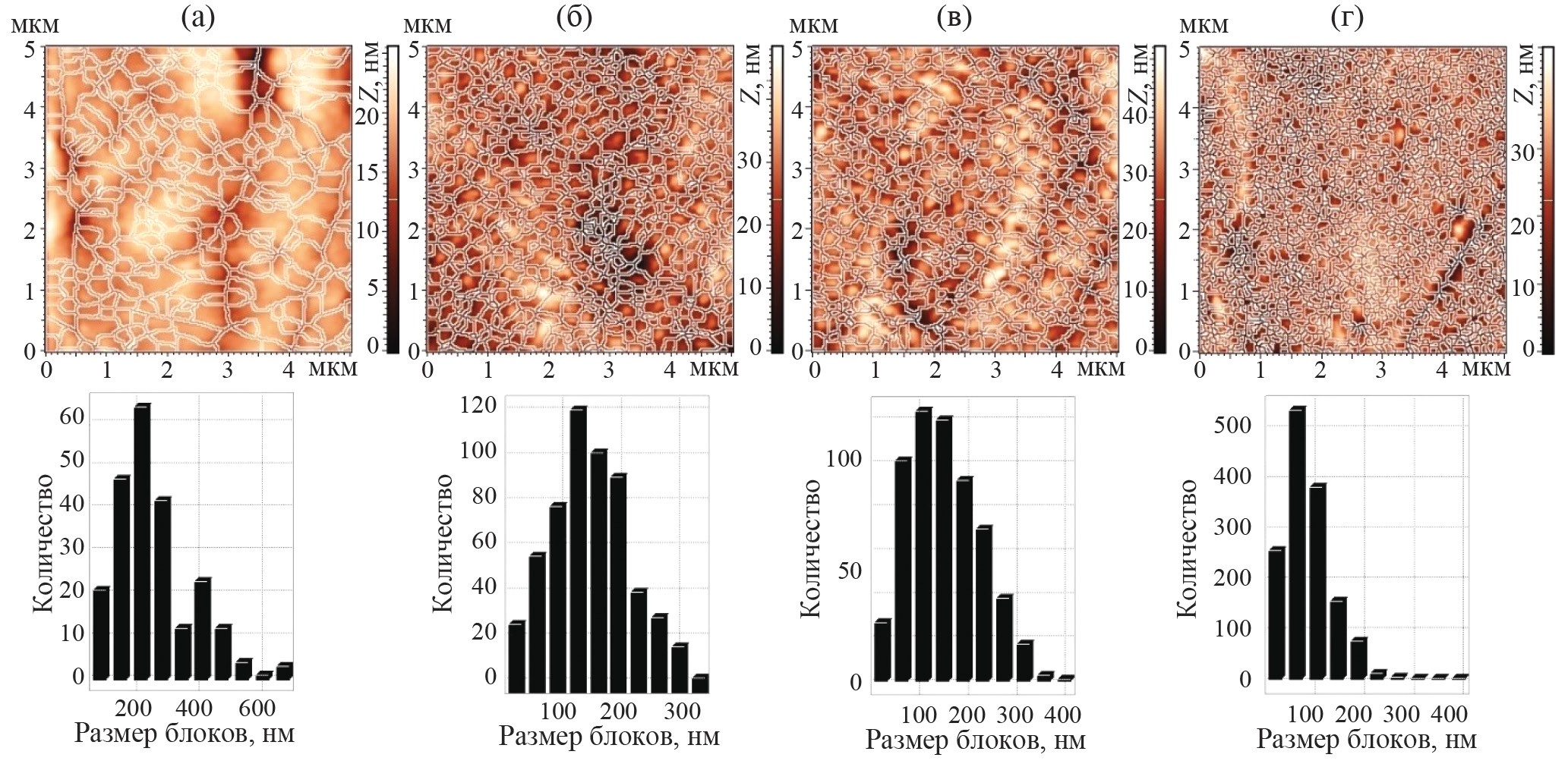 Рис. 8. Распределения по размерам блоков на поверхности образцов титанового сплава ВТ6 до имплантации (а), после имплантации ионов O+(б), после поочередного облучения ионами O+ и N+ с дозой ионов N+ 1018 ион/см2 (в), после поочередного облучения ионами O+ и N+ с дозой ионов N+ 3·1018 ион/см2 (г).