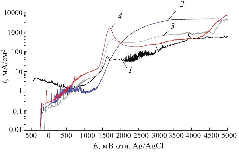 Образцы выдерживали в электролите в течение часа для достижения стационарного состояния. После этого записывали вольтамперную кривую образцов со скоростью 1 мВ/с от потенциала, который был на 300 мВ меньше потенциала разомкнутой цепи, и до 5000 мВ относительно Ag/AgCl. Все результаты приведены к 1 см2 площади поверхности образцов. Моделирование экспериментальных данных проводили с помощью программы ZView.