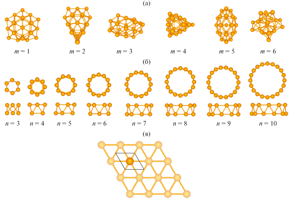 Объектами моделирования выступали кластеры из 25 атомов золота Au25,m, где m = 1–6, золотые нанотрубки с зеркальной симметрией (n, 0), где n = 3–10, двумерное золото – голден. На рис. 1 показаны их атомные структуры. В качестве стартовой конфигурации кластеров рассматривали пять структур кластера Au25 из работы [30] (m = 1–5) и золотая основа стабилизированного кластера [7] (m = 6).
