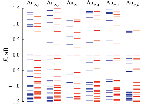 Рис. 4. Энергетические уровни кластеров Au25 с учетом (красные линии) и без учета (синие линии) спин-орбитального взаимодействия. Энергия отсчитывается от HOMO.
