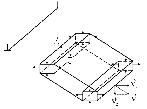 - Рост кристалла стартует с возникновения начального возбужденного состояния (НВС). НВС имеет форму вытянутого прямоугольного параллелепипеда, ребра которого коллинеарны собственным векторам ξi (i = 1, 2, 3) тензора деформации ê упругого поля дислокационного цента зарождения (ДЦЗ). Причем вытянутая ось параллелепипеда выбирается вдоль оси ξ3, соответствующей близкому к нулю собственному значению e3 ≈0тензора ê. Поперечные ориентации НВС вдоль ξ1 и ξ2 соответствуют разным знакам собственных значений e1 > 0, e2 < 0 тензора ê. Областям локализации НВС отвечают экстремальные значения деформаций.