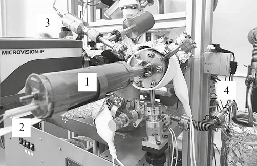 Рис. 3. Модуль для выдержки образцов в газе: 1 – камера экспозиции, окруженная внешним экраном; 2 – токовводы нагревателя; 3 – датчик давления; 4 – линия газонапуска с азотной ловушкой.