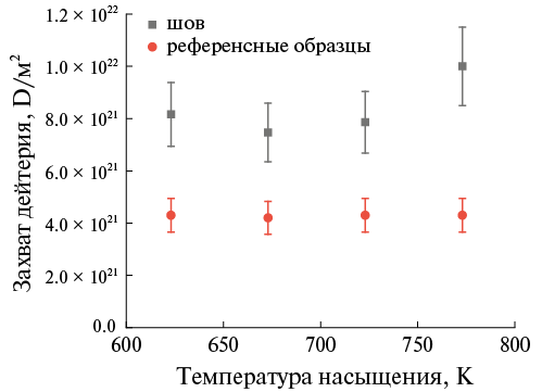 Показано, что образцы сварного шва захватывают в 1.5–2 раза большее количество дейтерия, чем обычные образцы.
