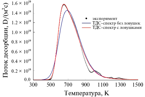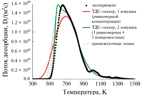 Моделирование термодесорбционных спектров проводили в программе TMAP7 [22], в которой транспорт водорода рассчитывается в одномерном приближении. Процессы диффузии водорода в металле и его захвата в ловушки в TMAP7 описываются следующей системой уравнений: