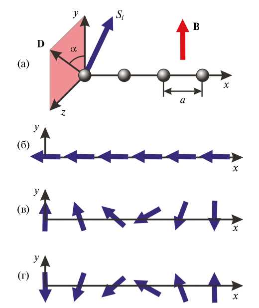 Рис. 1. Схематичное изображение атомной цепочки и осей координат. Вектор D лежит в плоскости yz. Вектор B направлен вдоль оси легкого намагничивания y (a). Схематичные изображения одновременного переворота магнитных моментов при перемагничивании короткой цепочки (б) и образования доменных стенок Нееля при перемагничивании длинной цепочки (в, г).