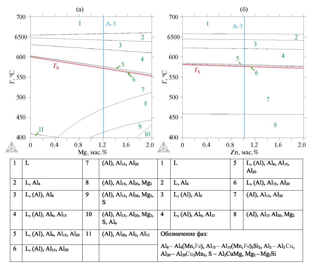 На первом этапе с использованием программы Thermo-Calc были рассчитаны политермические сечения системы Al–Cu–Mn–Fe–Si–Mg–Zn при постоянных концентрациях меди (2%) и марганца (1.5%) (рис. 1, 2). Они позволяют проанализировать раздельное влияние каждого из рассматриваемых элементов на фазовый состав базового сплава со средним содержанием остальных элементов. Из рис. 1а видно, что магний оказывает определенное влияние на фазовый состав базового сплава. Можно отметить подавление образования фазы Al2Cu при концентрации магния выше 0.4% и образования фаз Mg2Si и S (Al2CuMg) при концентрациях магния от 0.4% и 1% соответственно. Кроме того, магний значительно снижает температуру равновесного солидуса (TS). В отличие от магния цинк практически не влияет на фазовый состав и лишь незначительно снижает TS при концентрациях до 2% (рис. 1б). Политермические сечения с переменной концентрацией железа и кремния (рис. 2) показывают существенное усложнение фазового состава при добавлении этих элементов в базовые сплавы. Железо незначительно влияет на солидус (рис. 2а), в то время как при повышении концентрации кремния выше 0.4% значение TS резко снижается (рис. 2б), оставаясь тем не менее на достаточно высоком уровне (около 550°С при 1%Si).
