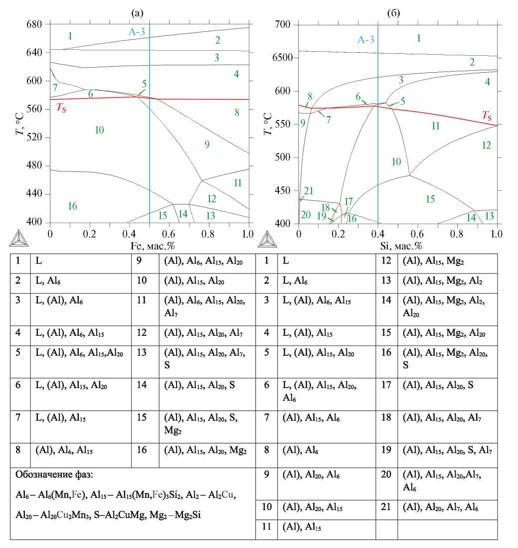 Рис. 2. Политермические сечения системы Al–Cu–Mn–Fe–Si–Mg–Zn при 2%Cu, 1.5%Mn, 1%Mg и 1%Zn: (а) при 0.4%Si, (б) при 0.4%Fe.