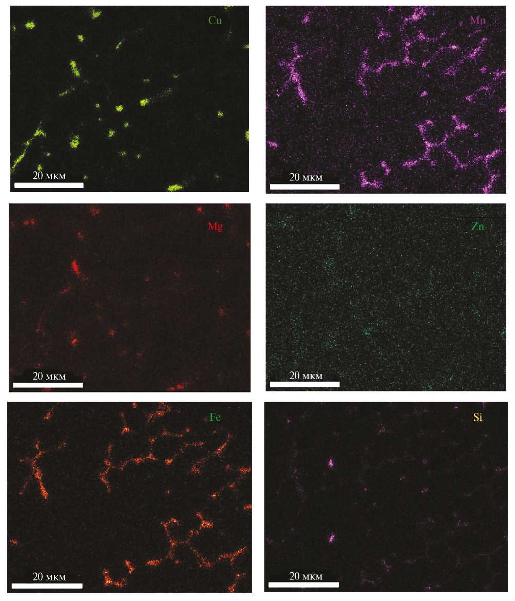 Анализ микроструктур слитков, приведенных на рис. 4, показывает, что фазовый состав всех экспериментальных сплавов достаточно хорошо коррелирует с расчетными зависимостями T–Q (рис. 3). Единственное несоответствие заключается в том, что в сплавах А-1 и А-3 происходит подавление образования фазы Al6(Fe,Mn). Как известно из ранних исследований [10–12], это является следствием повышенной скорости охлаждения слитков при кристаллизации и низкой диффузии марганца при высоких температурах, из-за чего этот элемент в сплавах А-0 и А-2 (рис. 4а, в) практически полностью остается в твердом растворе алюминия, а в сплавах с железом и кремнием А-1, А-3 (рис. 4б, г) частично расходуется на образование фазы Al15(Mn,Fe)3Si2. В качестве примера на рис. 5 приведены карты распределения элементов в микроструктуре слитка сплава А-3, подтверждающие идентификацию фаз Al15(Mn,Fe)3Si2, Al2Cu, и Mg2Si.