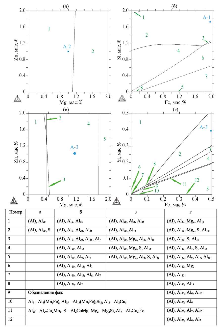 Предполагая, что после отжига холоднокатаных листов при 400°С возможно формирование фазового состава, близкого к равновесному, был проведен расчет изотермических разрезов рассматриваемой системы для данной температуры (рис. 6). Из рис. 6а следует, что добавление магния и цинка (по 1%) в базовый сплав не меняет его фазовый состав, в котором кроме (Al) должна присутствовать единственная избыточная фаза Al20Cu2Mn3. Из этого следует, что в сплаве А-2 данные элементы должны быть полностью растворены в (Al). Из рис. 6а также вытекает, что при повышении концентрации магния в сплаве А-2 более 1.2% следует ожидать появления S-фазы. Фазовый состав сплава А-1 сложнее, поскольку расчет показывает наличие фазы Al15(Mn,Fe)3Si2, содержащей Fe, Mn и Si, а также фазы Al2Cu (рис. 6б). Фазовый состав наиболее легированного сплава А-3 вытекает из изотермических разрезов, приведенных на рис. 6в, г, согласно которым в нем должны присутствовать фазы Al20Cu2Mn3, Mg2Si, S и Al15(Mn,Fe)3Si2. Также следует отметить, что в сплаве А-3 одновременное снижение концентрации железа и кремния вплоть до 0.1% не повлечет за собой изменение фазового состава так же, как и изменение концентрации магния до 0.5%.