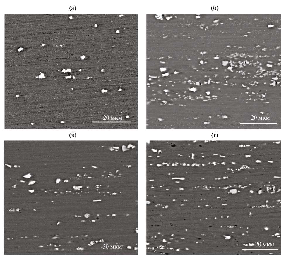 Рис. 4. Микроструктура слитков экспериментальных сплавов, СЭМ: (а) A-0; (б) A-1; (в) A-2; (г) A-3.