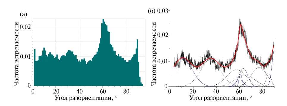 Рис. 3. Экспериментальная (а) и модельные (б) гистограммы распределения угла разориентации α-кристаллитов в поперечном сечении (TD) плиты сплава. Сплошная линия черного цвета соответствует экспериментальной гистограмме, жирная сплошная линия красного цвета — суммарной функции Гаусса, состоящей из функций Гаусса для о.с. Бюргерса (сплошные тонкие линии) и для двойниковых ориентаций (пунктирные линии).