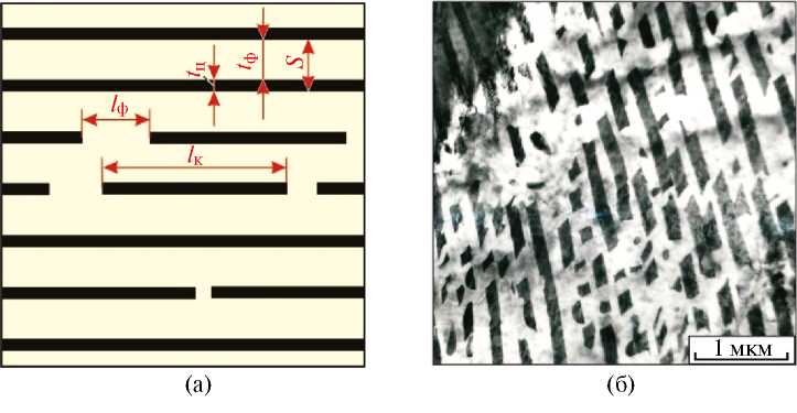 Рис. 5. Прерывистые цементитные пластины в структуре пластинчатого перлита: а — схема; б — ПЭМ-изображение.