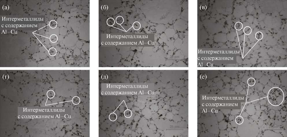 Рис. 3. Оптические изображения микроструктуры изготовленных образцов: (a) образец 1; (б) образец 2; (в) образец 3; (г) образец 4; (д) образец 5; (е) образец 6.