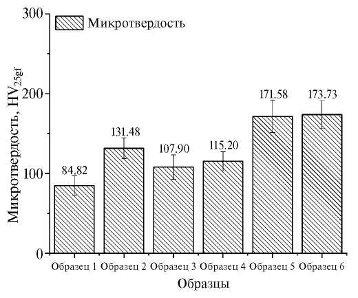 На рис. 8 приведены результаты измерения микротвердости образцов. В целом, самые низкие значения микротвердости обнаружены в образцах, спеченных при 380°C (образцы 1, 2 и 3). В этой группе образцов наименьшую твердость имеет образец с наименьшим содержанием Cu (образец 1 — 84.82 HV). Аналогичная ситуация наблюдалась в группе образцов, спеченных при температуре 580°C. Как можно понять, уменьшение содержания Cu свидетельствует о снижении количества образовавшихся интерметаллидов и меньшем измельчении зерна. Поэтому можно говорить об увеличении подвижности дислокаций и снижении прочности. Наибольшие значения микротвердости наблюдались в образцах, спеченных при температуре 580°C. Кроме того, это образцы с наибольшим содержанием Cu (образец 3 и образец 6). Наибольшую микротвердость имеет образец 6 — 173.73 HV. При сравнительной оценке групп образцов значения микротвердости увеличиваются по мере повышения температуры спекания. Это указывает на то, что повышение температуры спекания повышает эффективность механизма межзеренного жидкостного спекания образца. Поэтому содержание жидкой фазы между зернами увеличивается. Увеличение этих образований приводит к возрастанию плотности образцов. Поэтому образцы с наибольшей относительной плотностью отличаются также высокой микротвердостью (смотри рис. 1 для образца 5 и образца 6, что касается плотности). За счет оптимизации состава сплава и процесса изготовления микротвердость образцов была повышена в 1.3 — 2.1 раза.