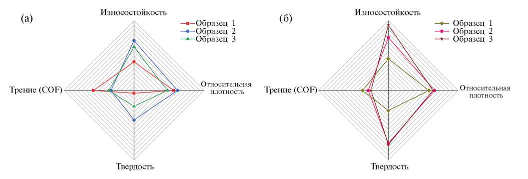 Рис. 12. Сравнение микроструктурных, механических и трибологических характеристик образцов с различным химическим составом: a — спеченных при 380°C, б — спеченных при 580°C.