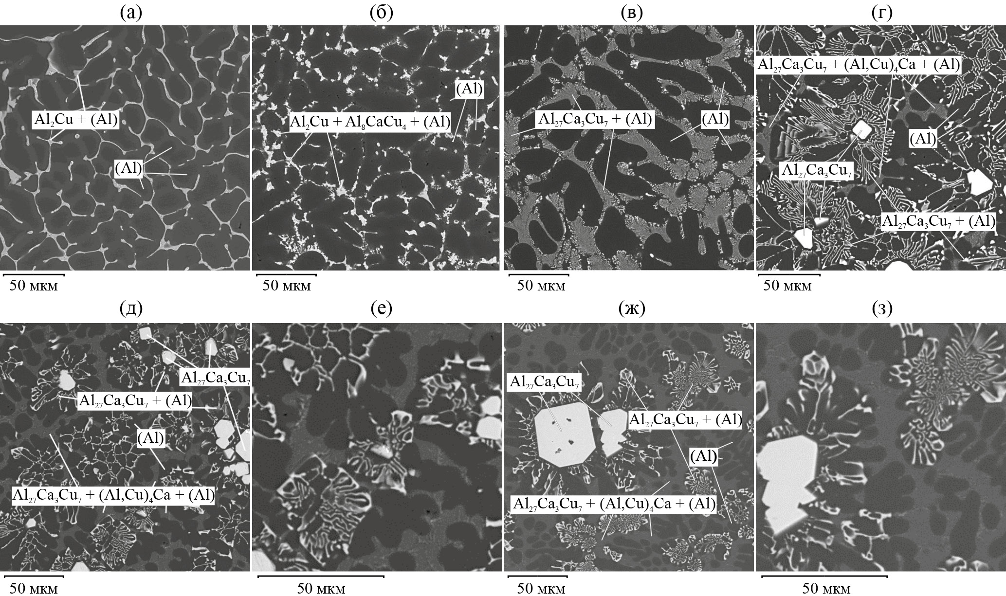 Рис. 1. Микроструктура экспериментальных сплавов в литом состоянии, СЭМ: (а) 0Ca; (б) 0.5Ca; (в) 1Ca; (г) 2Ca; (д–е) 3Ca; (ж–з) 4Ca.