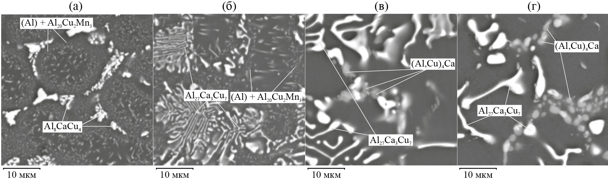 В сплаве 1Ca, содержащем значительное количество эвтектики (Al)+Al27Ca3Cu7, эти дисперсоиды также четко выявляются (рис. 4б). При этом частицы фазы Al27Ca3Cu7 не проявляют заметных следов фрагментации. Другая картина наблюдается в сплавах с большим содержанием кальция. В них полностью отсутствуют следы образования дисперсоидов Al20Cu2Mn3, а, с другой стороны, видны глобулярные частицы фазы (Al,Cu)4Ca (рис. 4в, г). Это можно связать с тем, что при таких концентрациях кальция сплавы попадают в другую фазовую область, в которой фаза Al20Cu2Mn3 отсутствует.