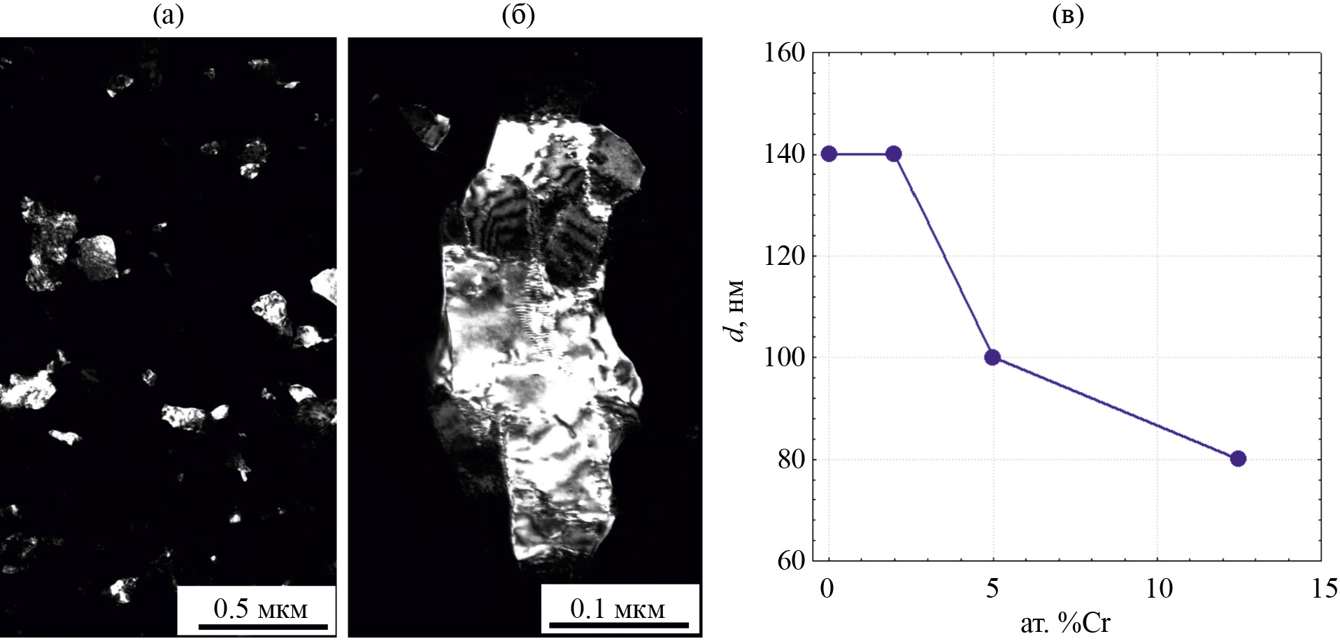 Рис. 1. Микроструктура сплавов Ni–12.5Cr (а) и Ni–2Cr (б) после деформации СПД и зависимость среднего размера микрокристаллитов от содержания хрома (в); а, б – темнопольные изображения в рефлексе типа (111)γ, ПЭМ.