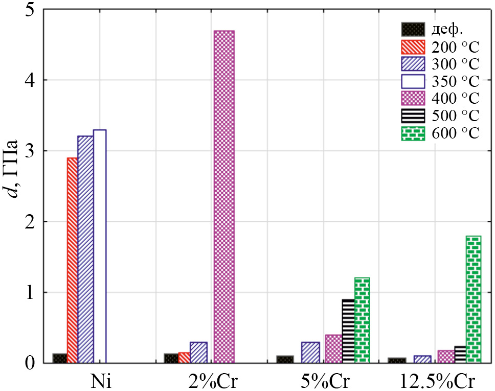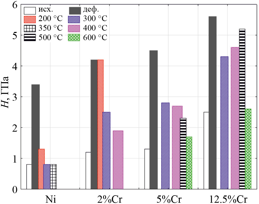 В результате отжига при 300°С твердость никеля упала практически до исходного (до деформации) значения и после отжига при 350°С больше не снижалась. Во всех исследованных сплавах твердость снижается существенно меньше (рис. 2). В сплаве с максимальным содержанием хрома понижение твердости минимальное, около 1 ГПа. Эти изменения твердости согласуются со структурными изменениями (рис. 4).