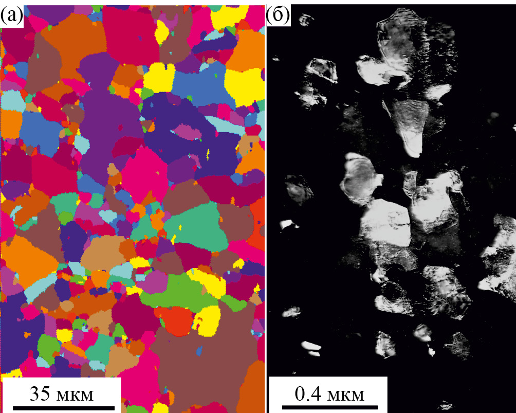 Рис. 3. Микроструктура никеля (а) и сплава Ni–2Cr (б) после деформации СПД и отжига при 200°С, 1 ч; а – EBSD-карта зерен в произвольных цветах, СЭМ; б – темнопольное изображение в рефлексе типа (111)γ, ПЭМ.