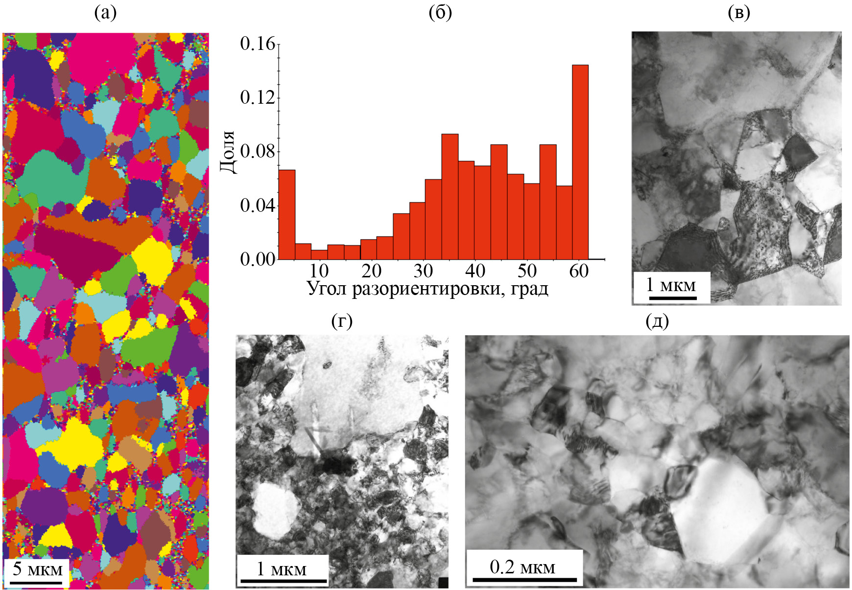 Рис. 5. Микроструктура сплава Ni–2Cr (а, б), Ni–5Cr (в, г) и Ni–12.5Cr (д) после деформации СПД и отжига при 400°С, 1 ч; а, в – EBSD-карты зерен в произвольных цветах, СЭМ; б, г, д – светлопольные изображения, ПЭМ.