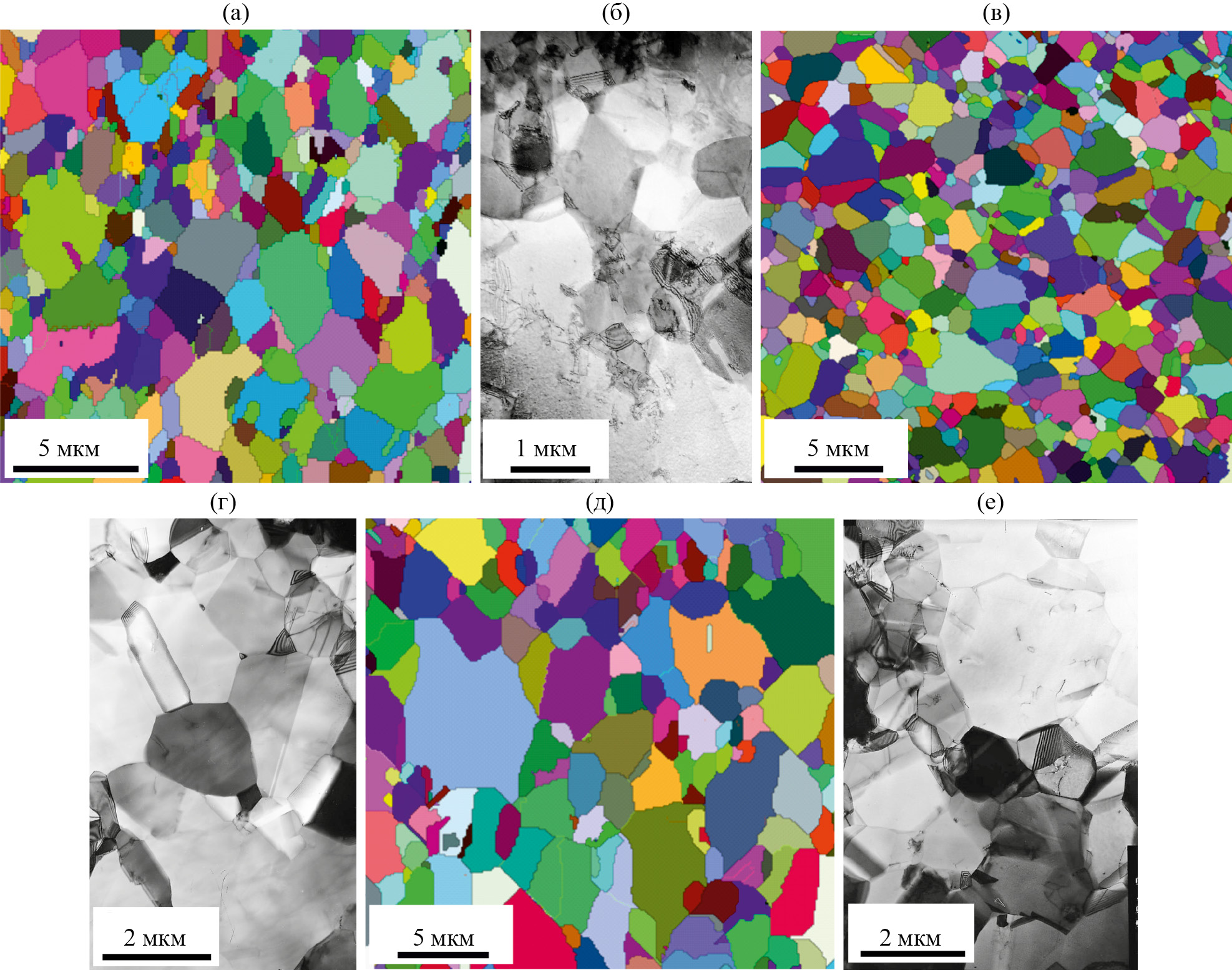 Рис. 6. Микроструктура сплава Ni–5Cr (а–г) и Ni–12.5Cr (д, е) после деформации СПД и отжига при 500°С (а, б) и 600°С (в–е), 1 ч; а, в, д – EBSD-карты зерен в произвольных цветах, СЭМ, б, г, е – светлопольные изображения, ПЭМ.