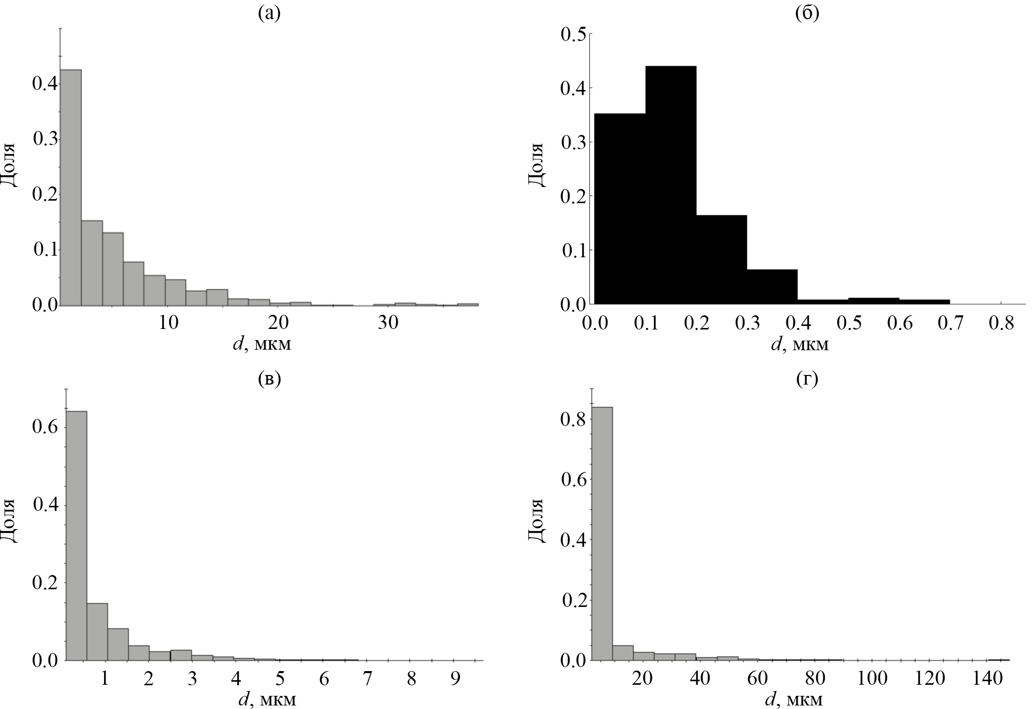 Рис. 8. Гистограммы распределения зерен по размерам в Ni (а) и сплаве Ni–2Cr (б–г) после деформации СПД и отжига при 200°С (а, б); 300°С (в); 400°С (г).